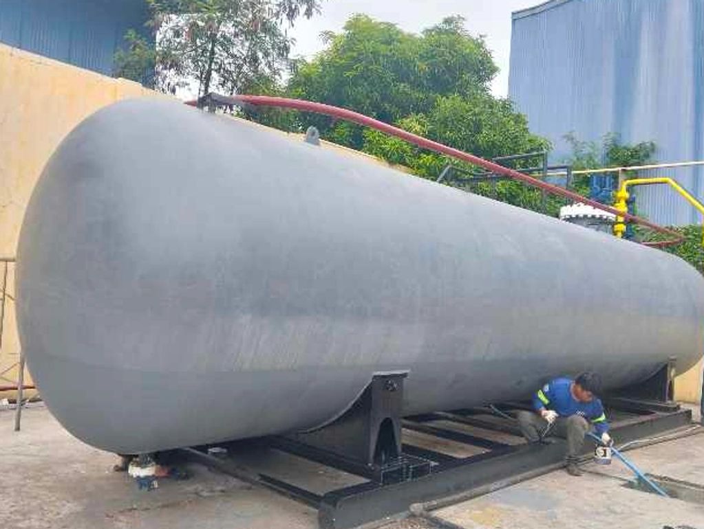 An LPG tank is shown coated with a layer of industrial-grade primer after surface preparation and inspection. The primer serves as the first protective coating applied directly onto the bare metal, providing corrosion resistance and enhancing paint adhesion. This stage marks the transition from inspection to surface protection, ensuring the tank’s longevity and readiness for the final coating and