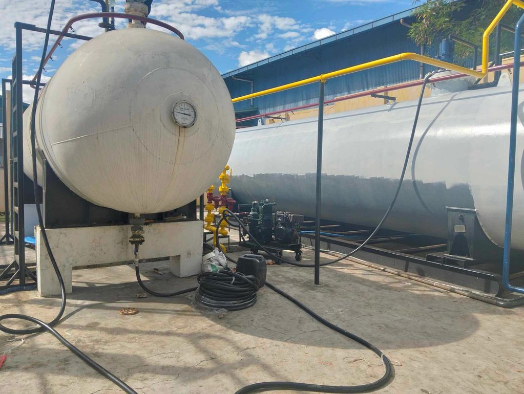 A trained technician operates an LPG compressor to safely transfer remaining LPG from a storage tank during decommissioning and degassing procedures. The process ensures that all residual gas and vapor are fully recovered, minimizing product loss and eliminating safety hazards before inspection or maintenance. This controlled transfer method is a critical step in maintaining environmental safety,
