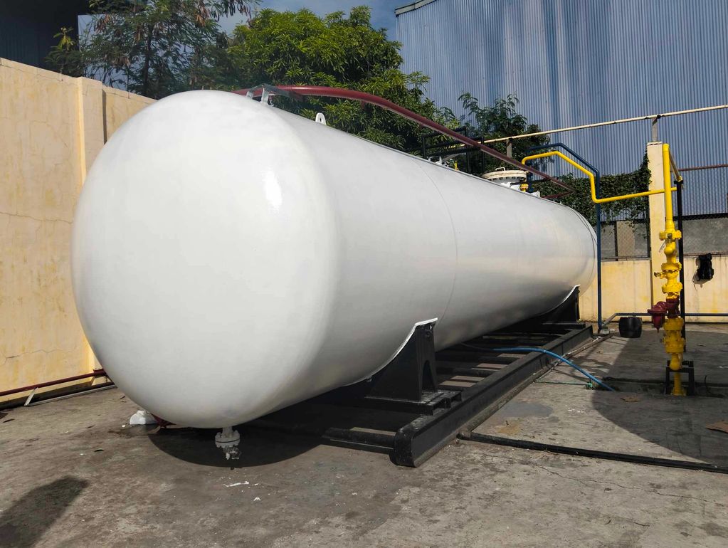 An LPG tank is fully painted with a smooth white topcoat, giving it a clean, polished appearance after primer curing. The white finish not only provides aesthetic appeal but also serves as a protective barrier against corrosion, UV exposure, and environmental wear. This final coating stage completes the requalification process, ensuring the tank meets safety, durability, and regulatory standards b